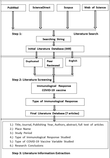 With strict literature search and screening processes, it yielded 7 articles from 349 articles of initial literature database. Needed article information was extracted from each article by : 1) direct information including journal, title, authors, abstract, full text documents of candidate studies, publishing year; 2) place name of the study area; 3) study period; 4) research method used; 5) type of kidney-transplantation-immunological- response variables studied; 6) types of COVID-19 vaccine studied; and 7) the conclusions made about the impacts of related- humoral-immunological-response on kidney-transplanted recipients. An overview of the information required for the present analysis that was captured by those themes was shown in the Figure 1.