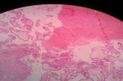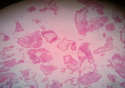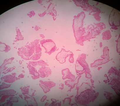 Microscopic examination: Sections showed multiple chorionic villi of variable sizes, predominantly hydropic and admixed with few normal appearing villi. Enlarged villi were irregularly shaped with scalloped borders and secondary trophoblastic pseudo-inclusions were seen. Fetal nucleated RBCs were abundant. Circumferential trophoblastic hyperplasia was noted. Based on the above histological features a diagnosis of partial molar ectopic pregnancy was made. However, patient was advised karyotyping for further confirmation. Follow up with serial B HCG estimation was done which showed a gradual decline.