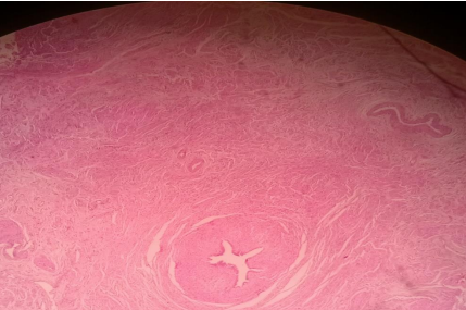 Gross examination: The content of tube consisted of grey, brown hemorrhagic material along with a part of patent fallopian tube measuring 4.5x 2.2x 1.3cm. Entire tissue was submitted for histopathological examination.