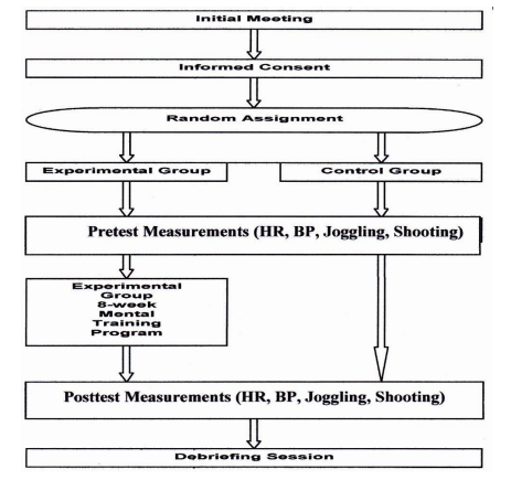 This study employed an eight-week pretest-posttest design that engaged 56 participants (NCAA Division III College Soccer Players) who were randomly assigned to either the experimental group or the control group (each consisting of 28 athletes). The participants in the experimental group went through the eight-week mental training program that synthesized eight (one-hour) mental training sessions utilizing breathing techniques and guided imagery. The participants in the control group did not receive any mental training.