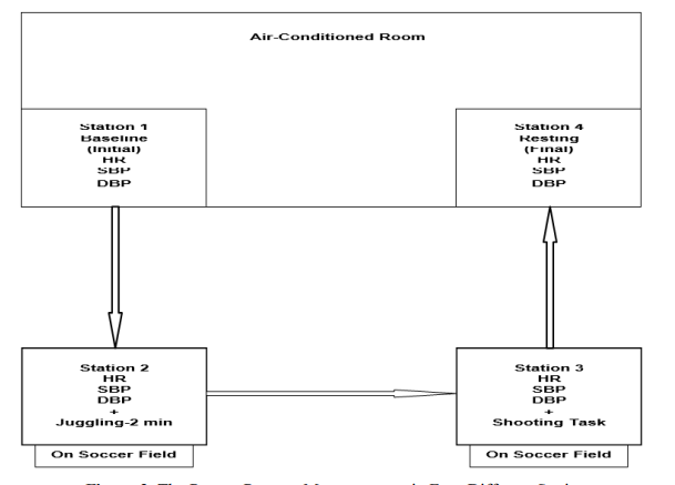 In station one, the participant was measured twice, first in standing and immediately after that in sitting position for heart rate and blood pressure. The readings were taken in an air- conditioned room in order to gain the baseline-initial measurements of cardiovascular activity. Right after the initial measurements, the participant went on to the soccer field to station two where he or she was measured (in standing) for heart rate and blood pressure right before the juggling contest. Right after the measurements (a two-second limit allowed for removing the cuff), the participant performed the juggling contest (at most a two-minute interval). Right after the juggling contest, the participant went to station three, where he or she was measured (in standing) for heart rate and blood pressure right before the execution of the shooting contest (at most a one-minute interval). Right after the participant performed the shooting contest, he or she went back to another air-conditioned room (station four) and was measured (in sitting) for heart rate and blood pressure for the recovery-stress response. A diagrammatic chart of the pretest-posttest measurement stations is presented below (see Figure 2).