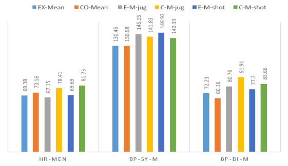 The heart rate (bpm) analyses showed that there was a positive relationship between the participation of the men in the experimental group in the eight-week mental training program and the moderation of cardiovascular activity, t (19.86) = -2.38, p = .027, Cohen’s d of 0.96. The systolic and diastolic blood pressure (mmHg) values before the juggling contest in the experimental group and in the control group were not significantly different (see Table 4).