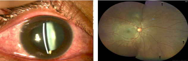 We present the case of a 34 year-old female with sudden blurring of vision on the right eye. Four weeks prior to consult, patient had a penetrating eye injury on the left when glass shards hit her eye during an altercation with her husband (Figure 1). That same eye went blind and underwent evisceration two weeks after the initial injury. The right eye had been unremarkable until 4 weeks post-injury when she presented to our clinic with a 2-day history of eye redness, tearing, dull eye pain and blurring of vision. There was no history of prior ocular diseases or surgeries except those mentioned previously.