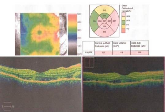 Fig. 5. Thickening of foveal and perifoveal areas, with hyporeflective spaces in the subfoveal neurosensory retina