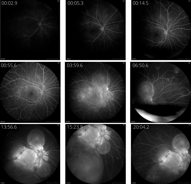 Fig. 6. Diffuse hyperfluorescence on the posterior pole that enlarge and increase in intensity throughout the late phase corresponding to exudative retinal detachments