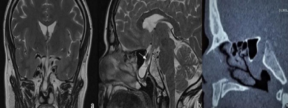 Figure 1: a- coronal section of MRI showing the importance of herniation if the sellar and part of the suprsellar contents .b- on the sagittal section , the abnormal and thickened pituitary stalk is showed by the white arrow .c- the sinus CT showed the bony limits of the defect from the clical recess to the anterior face of the sella.
