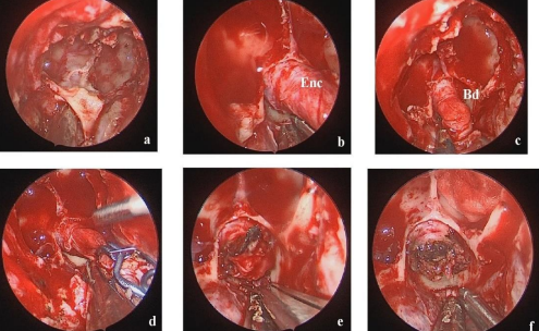 The repair of the encephalocele was performed using an endoscopic endonasal approach. the sac was resected at the most distal part after being coagulated. We have performed a usual an endoscopic enodonasal binostril approach. After the sphenoidotomy , we can appreciate the bony borders extensions of the encephalocele the long of the sellar floor (image a - figure 2). The sac of was dissected 360 degrees from the bony defect that was individualized clearly. after clipping the lower extremity of the malformation we have tried first to puncture it sing a syringe to reduce tension inside the sac without getting CSF. we have coagulated and sectioned it just superior to the vascular clip. the reconstruction of the bony defect was secured with double layers of fascialata and a nasoseptal flap that was harvested in the right nostril.