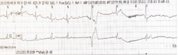 Figure 2:Rhythm strip of the telemetry revealing a short run of severe bradycardia with ventricular escape beats.