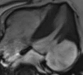 Figure 5 Cardiac MRI (CMR) showing outpouching from the basal anterolateral and inferolateral left ventricular wallwith associated myocardial thinning, severe dyskinesia and near transmural sub-endocardial late gadolinium enhancement.