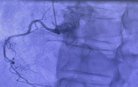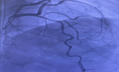 Figure 6:Coronary angiogram showed focal minor disease in the mid left anterior descending artery (10% stenosis), but was otherwise entirely normal i.e., there was no significant coronary artery disease.