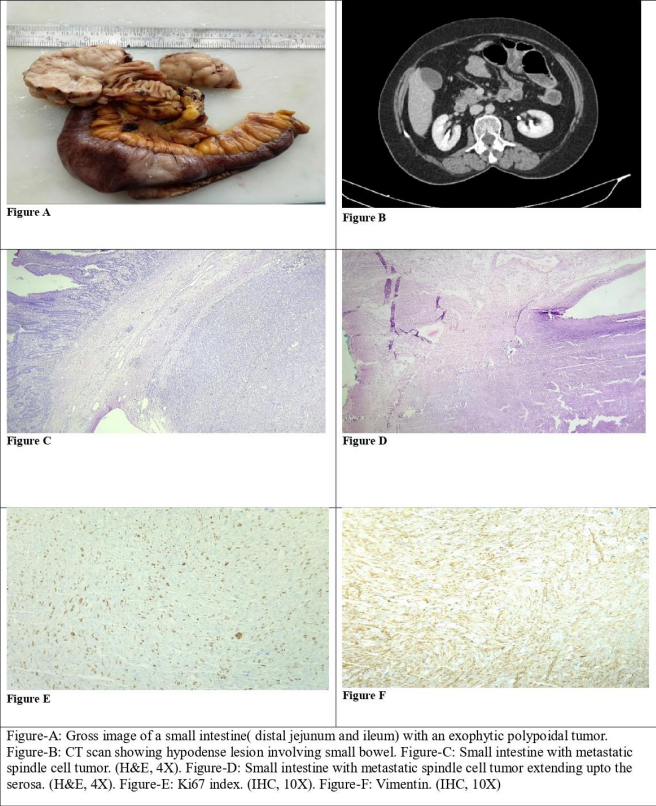 In 2022, the patient presented with abdominal pain and vomiting. Computed Tomography (CT) scan of the abdomen (figure1,B) showed a 68x55x54 mm hypodense lesion involving bowel loops in the pelvic region. The possibility of a malignant mass lesion was given in the scan report. We received a small bowel resection specimen(figure1,A) measuring 25 cm in length. The specimen consisted of distal jejunum and ileum. On cutting open, it showed an exophytic polypoidal neoplasm measuring 65x55x45mm. Microscopy(figure1C, D)(figure2,I) showed spindle to fusiform tumor cells showing marked nuclear pleomorphism, multinucleation, and mitoses. No epithelial component was found. Mucosal ulceration and focal necrosis were evident. The tumor involved the full thickness of the bowel wall. It was reported as a poorly differentiated malignant neoplasm. Immunohistochemistry (IHC) was done. Vimentin was positive and Ki67 index was 30%.(figure1, E,F) Rest all markers AE1, CD34 (cluster of differentiation), c-kit (CD117, stem cell factor receptor), DOG1(Discovered on GIST-1), h-caldesmon, Desmin, SMA(smooth muscle actin), and ER(estrogen receptor) were negative. The final diagnosis rendered was metastatic malignant phyllodes tumor. The patient received chemotherapy and was doing well. In February 2023, she again developed lung metastases.