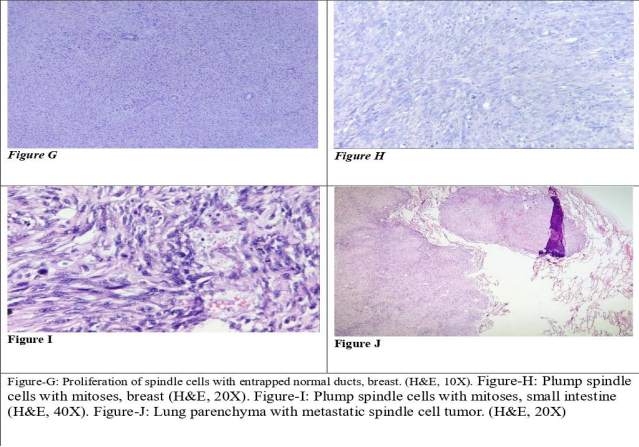 A 59-year-old lady presented with a left breast lump in 2016. Mammogram showed a lobulated soft tissue opacity in the lower inner quadrant of the left breast which on ultrasonography (USG) appeared as a 58x56 mm sized lobulated hypoechoic lesion with an internal cystic area. A possibility of highly suspicious malignant mass-phyllodes tumor (BIRADS 4C) was given. The patient underwent fine needle aspiration cytology (FNAC) procedure; which on microscopy showed cellular fragments of spindle cells with marked nuclear pleomorphism and mitoses. It was reported as a malignant spindle cell neoplasm with two possibilities; either malignant phyllodes tumour or metastasis from spindle cell sarcoma. Following this, the patient was operated and we received a left Modified Radical Mastectomy (MRM) specimen. On gross, it showed a 60x55x40 mm-sized tumor occupying the whole of the lower inner quadrant of the left breast. On histopathology (figure 2, G,H) the tumor was composed of spindle cells showing marked nuclear pleomorphism, stromal overgrowth (absence of epithelial elements in one low-power microscopic field showing only stroma), 15-16 mitoses / 10 high-power fields, diffuse stromal cellularity and infiltrative border. It was reported as a malignant phyllodes tumor. Heterologous element was not seen. All 13 lymph nodes were free of tumor. It was staged as pT2N0. The patient was on regular follow-up.