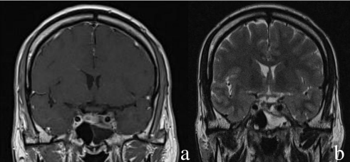 Figure 1: a- coronal T1 + contrast MRI showing a pituitary adenoma invading the left cavernous sinus with a heterogeneous enhancement- coronal T2 showing a CSF collection in the left sphenoid sinus.