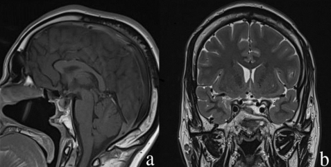 Figure 2: a- sagittal T1 with contrast showing the vascularized nasoseptal flap without CSF collection in the sinus. b- coronal T2 MRI showing a good response for medical treatment with tumor shrinkage.