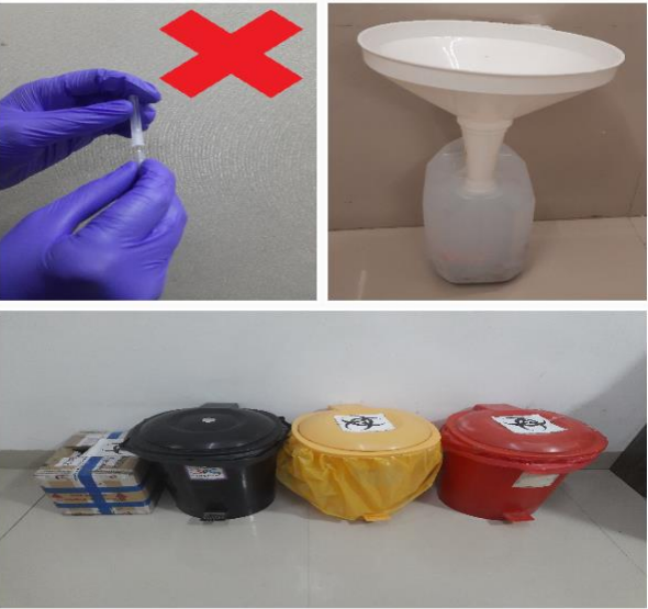 Due to the funnel-shaped design and often lack of safety lids, standard sharp containers are filled quickly leading to overflow if not replaced in a timely manner. HCP should be aware that a sharp container should be replaced if filled to 75% of its capacity. Overfilling containers with additional sharp waste does not necessarily put physicians in danger, instead, it is risky for other healthcare professionals including housekeepers who are trying to empty the containers.