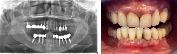 Figure 5: Clinical photograph and the panoramic radiograph of patient and after bridge delivery, day of placement