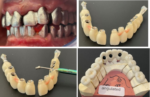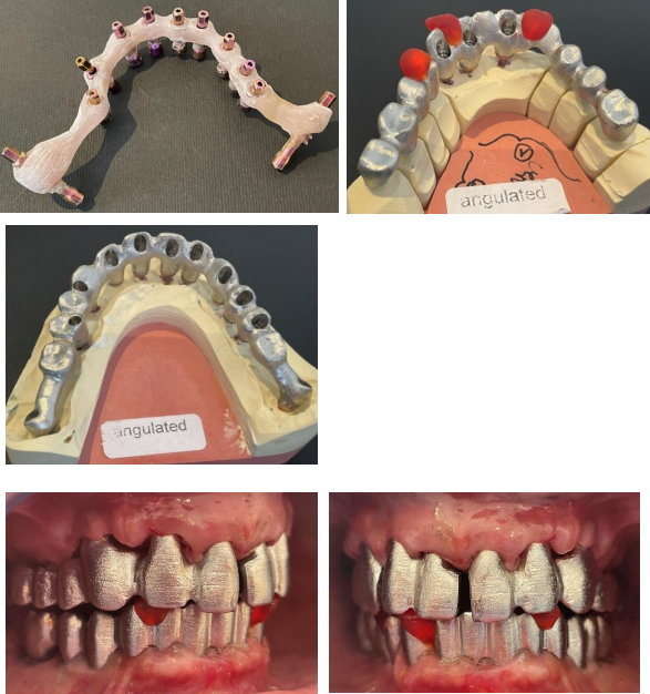 The bridge in the maxilla is in 2 parts and screw retained, here angulated screw channels were used in order to get perfect fit. In the mandible the bridge is screw and cement retained.