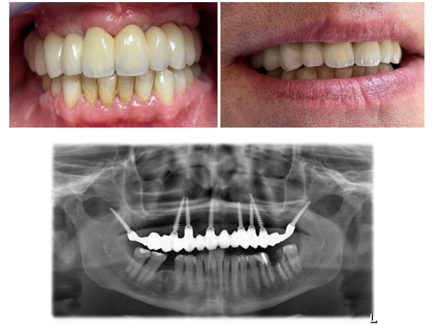 Three weeks after initial consultation, patient´s mouth was rehabilitated with definitive metal ceramic bridges. This was made possible due to the achieved bicortical anchorage in the anterior part and a strong cortical anchorage at the pterygoid plates (75 N/cm) in the maxilla, these anchorage ensured high primary stability which encourages immediate loading. Fig 5