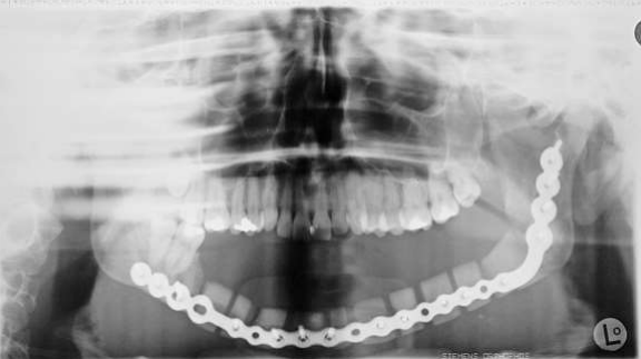 Fig 5:Juni 1997: resection of the lower jaw regio 46-37, plate for reconstruction, AAA-bone histology: ossyfying fibroma turned into osteosarkoma grade III, resection non in sano