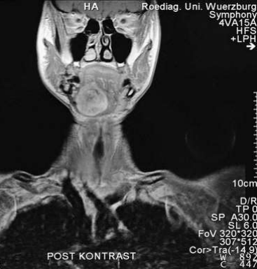 Fig 8: 2001/12: recurrence fibrosarcoma, anterior resection floor of mouth, histology: fibromatosis with highly differentiated soft tissue sarcoma (G1)