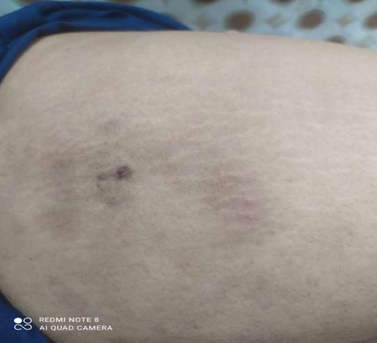 A 40-year-old female patient presented to us with a history of waxing and waning skin lesions over a course of a year. She initially noticed the lesion 14 months ago which was a red-brown papulonodular eruption over the left buttock which became haemorrhagic and necrotic over the duration of a week. Following this, she consulted a physician who started her on antifungal treatment. The lesion gradually resolved to leave behind a residual hyperpigmented patch with central scarring. The lesion further flared up after a gap of two months. Allergic etiology was initially considered, and corticosteroids and antiallergics were prescribed. There were two more similar episodes of events over the duration of the next eight months for which she received courses of antibiotics, emollients and antifungals. A diffuse hyperpigmented patch of 5 × 4 cm in dimension with a single well-defined hyperpigmented macule centrally associated with scarring on the surface of the left buttock. Perilesional scaling was also present (Fig 1).There was no mention of pruritis. Mucous membranes, palms and soles were not affected. No enlarged lymph nodes in a local or distant region. The history revealed no consistent systemic B symptoms. Among the differential diagnosis were lymphomatoid papulosis, other cutaneous lymphomas, histiocytosis, sarcoidosis and cutaneous T cell neoplasm.
