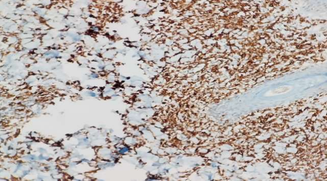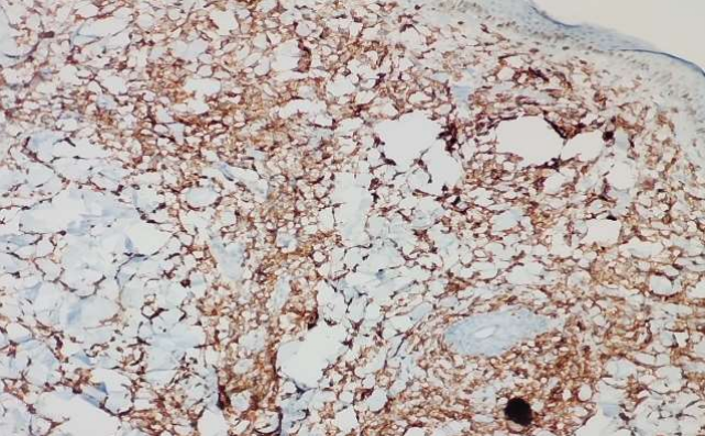 A skin biopsy revealed an interstitial infiltration of atypical cells without epidermotropism in the dermis and subcutaneous tissues. The tumour cells had ill-defined borders, moderate to abundant cytoplasm and oval, elongated or cleaved nuclei with occasional nucleoli with pale to hyperchromatic chromatin. The background consisted of some T cells and scattered small lymphocytes. (Fig 2) Immunohistochemistry, the atypical cells showed positive staining for leukocyte common antigen (LCA), CD30, CD68, and CD4 (Fig 3,4) while negative for CD20, CD45, MPO, CD34, CD117, ALK, PAX-5, AND CK; Ki-67 – 70-80%. (Fig 5) The final diagnoses considered were Lymphamatoid Papulosis Type C or small cell variant of ALCL.[5]A final diagnosis of LyP type C was made based on the waxing and waning course of the disease. Further evaluations including a complete hemogram, chest radiograph, and ultra-sound of the abdomen which did not reveal any abnormality. After careful counselling, patient was asked to be in close observation and steroid cream for local application. Patient was instructed to report she developed any of the following: