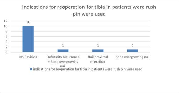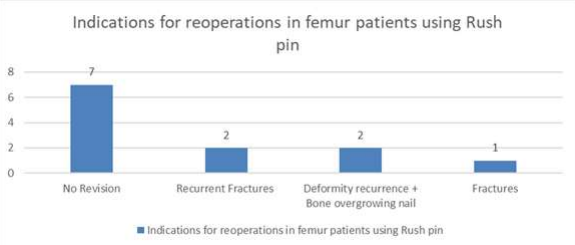 The reoperation rate for Rush pin group were 9 (47%) for femoral segments and 6 (30%) for tibial segments a median of 38% mostly due to recurrent fracture and bony overgrowth and recurrence of deformities. we believe that our result is comparable to Al Adl et al study [66].