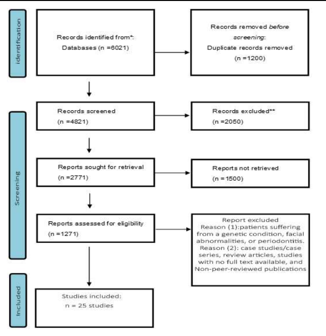 Previous systematic reviews found few papers that addressed our study issue. To broaden the research resources, randomized controlled trials (RCTs), observational studies, and any other study type, excluding case reports and case series, were included in this review. All of the research had to be about Invisalign appliances and required to quantify tooth movement or treatment results. Studies with treatment in conjunction with orthognathic surgery, patients suffering from a genetic condition, facial abnormalities, or periodontitis, case studies/case series, review articles, studies with no full text available, and Non-peer-reviewed publications were not considered in this study (Figure 1).