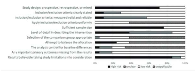 Observational study risk of bias was investigated using items drawn from the Research Triangle Institute item bank.[6] Twenty-nine questions from 11 categories intended for assessing observational studies were adapted to get 11 items for this review. Each question received a yes, no, partial, cannot determine, and not relevant response. Cannot determine and partial were thought to suggest a non-obvious risk of bias. The questions of the evaluation addressed overall bias in an individual study, and a study with more than one item scored as non-obvious or high risk of bias could not be classified as having a low risk of bias.