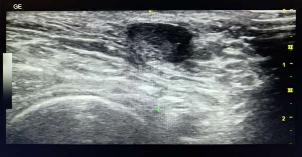 FIG1: A well-defined, ovoid thick-walled mixed echoic lesion with internal echoes measuring approximately 1.2 x 0.9 cm with minimal posterior acoustic amplification and surrounding inflammatory alterations in left axilla. The lesion shows lack of internal vascularity on colour Doppler.