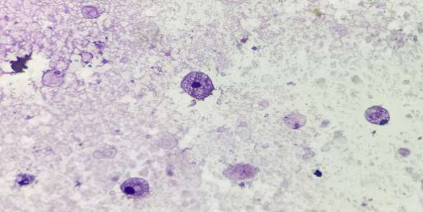 An ultrasound revealed a well-defined, ovoid thick-walled mixed echoic lesion with internal echoes measuring approximately 1.2 x 0.9 cm with minimal posterior acoustic amplification and surrounding inflammatory alterations in left axilla. The lesion shows lack of internal vascularity on colour Doppler. A cystic abscess was recommended as the most likely diagnosis based on the sonographic results and suggested histo-pathological correlation for further evaluation. Several foamy macrophages were visible in the fine needle aspiration smears that followed. Granular, proteinaceous material mixed with frothy lipid micelles and occasionally crystalloid substance was also visible in the background. Not a single lymphocyte, atypical or epithelial cells were identified. This ultimately resulted in the diagnosis of galactocele-related supplementary breast tissue.