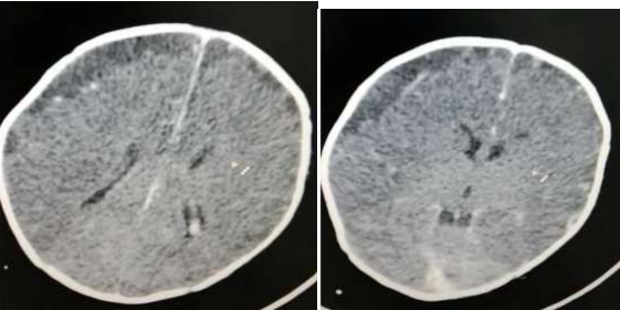 One month-old term, female infant was brought to the paediatric emergency due to convulsion. The mother of child reported no history of trauma and no previous admission. No maternal risk of sepsis, she has history of fever (documented reaching more than 38.c) since 1 week, no chills, and no rigors.