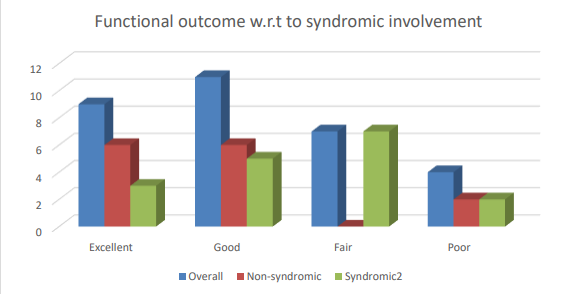 The preoperative and postoperative range of motion are presented in table 1. The mean preoperative ROM was 44.19±20.12 (18.54±13.67 extension to 25.64±12.36 flexion) and mean postoperative ROM was 103.38±29.25 (1.93±8.02 extension to 105.32±24.76 flexion). Thus, the improvement of 59.19±31.51 was noted and this improvement was statistically very highly significant (p<0.001). The postoperative mean power of quadriceps was 4.61±0.55 as per MRC grading. On the final postoperative assessment extension lag of 6.61±10.59 and flexion deformity of 3.38±6.63 was noted. The postoperative results were gauged as per the aforementioned outcome categorization system and the results showed that 9 knees (29%) had excellent, 11 knees (35,5%) had good, 7 knees (22.6%) had fair and 4 (12.9%) had poor functional outcome (figure 1). The figure also depicts that the functional outcome varied among the syndromic and non-syndromic patients.