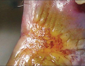 - Rinse with water/ carbocisteine syrup 250 mg/5 ml and dry with a gauze to clear the mucin.