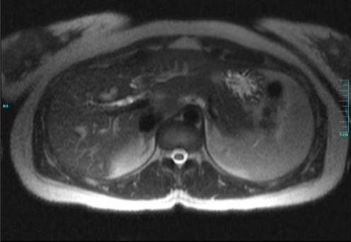 Figure 1A and 1B – MRCP showing the beading of the intrahepatic biliary tree with high grade strictures of the right and left hepatic ducts, suggestive of Primary Sclerosing Cholangitis