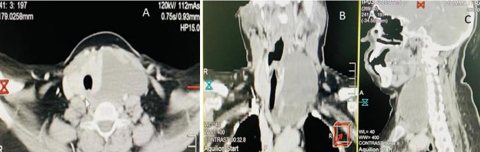 A High-resolution ultrasound revealed multiple hypoechoic nodules with micro-calcifications in the right lobe thyroid largest measuring 1.5*1 cm, TIRADS V, and another anechoic lesion adjacent to the left lobe of the thyroid. In addition, USG-guided FNAC suggested a Bethesda V lesion in the right lobe, and FNAC from the left lobe and cystic lesion were suggestive of colloid goitre. Because of the upper mediastinal extension of the lesion, a contrast-enhanced computed tomography of the neck and thorax was done, which was suggestive of a cystic mass measuring 10 × 7 × 8.5 cm adjacent to the left lobe thyroid displacing the left internal jugular vein and left common carotid. Along with nodular opacity and microcalcification in the right lobe thyroid. The superior and inferior extent from C3 cervical vertebrae to the aortic arch (Figure 1). Flexible laryngoscopy revealed no laryngeal or upper tracheal pathology except for the gross deviation of the laryngeal framework towards the right.