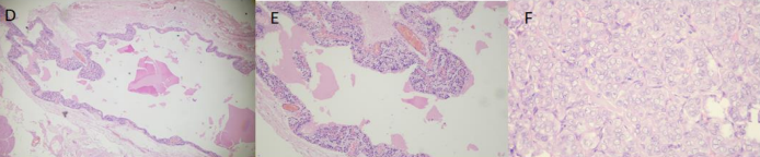 The patient underwent a Total thyroidectomy with excision of the cyst. Intra and immediate postoperative period was uneventful. The patient was discharged on postoperative day five with no signs of hypocalcemia. Final histopathology showed multifocal papillary carcinoma thyroid, a follicular variant with the largest foci of 1 cm; the cyst showed features of clear cells and a parathyroid gland along the wall. (Figure 2)