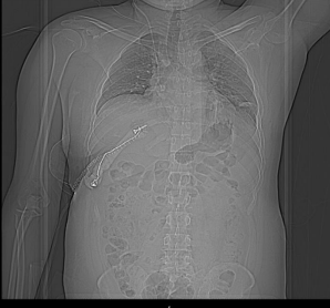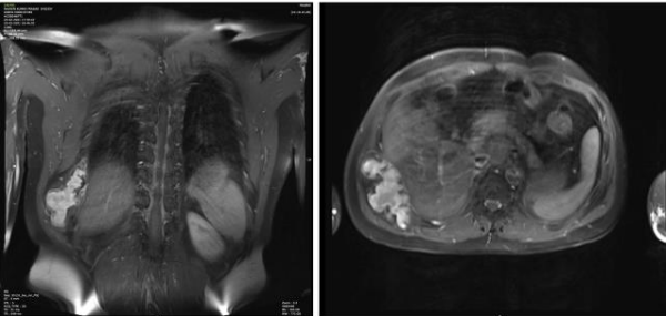 Case 2- 35 year old male who presented with a chest wall swelling and pain upon evaluation MRI was suggestive of a T1 intermediate and T2/STIR intermediate to Hyper-intense lesion from the Right 9 rib with extra-osseous soft-tissue component – coronal and axial images Fig-5 and histo-pathologically was found to have introsseous fibromatosis of the 9th rib. Following multidisciplinary team discussion and keeping in mind about the extra-osseous component and complex location of tumor patient was planned for a wide local excision of the tumor. The tumor was removed En-bloc along with part of the 10th rib because of the close proximity to 10th rib. Reconstruction was done using screws fixed to the cut ends of the bone and tagged with sternal wire and poly-methyl methacrylate mould was used to reconstruct the rib cage and augmented with mesh Post-op reconstruction X-ray Fig-6. Following the surgery on 2 year follow-up patient is disease free and doing well.