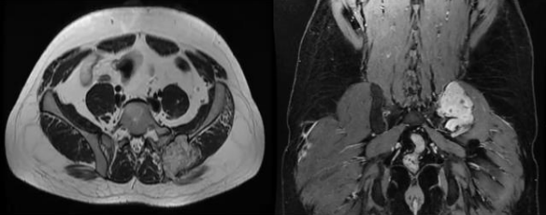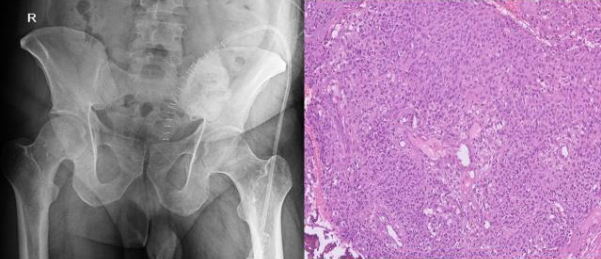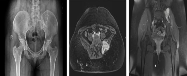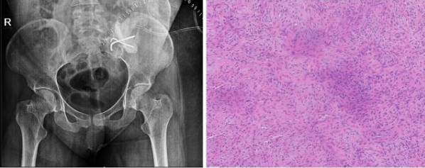 Case 4- 21 year old female patient who presented with pain and swelling of the left lower back area since 8 months. Upon clinic radiological evaluation – on x ray was found to have a lytic lesion in the left postero-superior iliac wing and MRI showed T2 intermediate to hyper-intense lesion on the left iliac wing with cortical breech and extra-osseous soft tissue component involving the iliacus muscle anteriorly and gluteus medius posteriorly measuring 5.9x5.6x6.3 cm with T2 hypointense rim around the lesion Fig-10. Histopathology proved to be fibromatosis and after multidisciplinary team meeting patient was planned for extended curettage and reconstruction Fig-11. Reconstruction was done using poly-methyl methacrylate cement and two K-wire for stabilisation with post-op Histopathology confirming the diagnosis Fig-12. Upon one year of follow up patient does not have any complaints and doing well.