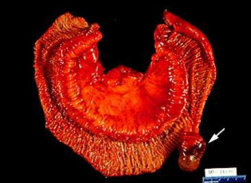 Picture 2: Gross picture of an intestinal polyp (arrow) removed from a patient with the PJS.