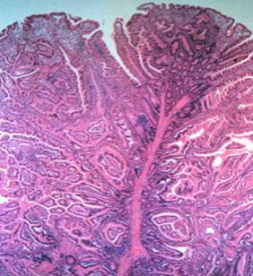 Picture 3: Low power view of a duodenal PJP shows a tree-like proliferation of smooth muscle lined by normal small intestinal epithelium; the overlying epithelium is normal.