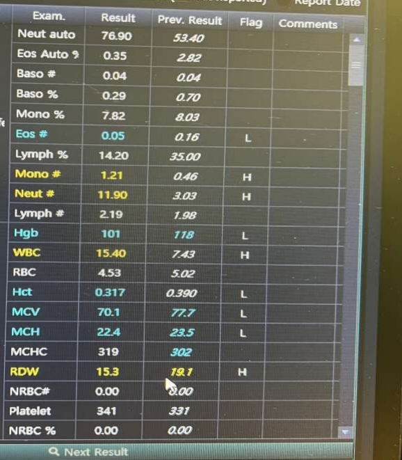 Picture 6: The complete blood count done for the patient that showing the microcytic hypochromic anemia.