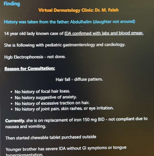 As you saw from then previous narration the patients’ findings were not compatible with any of the two major differential diagnosis of the lip HPGM, PJS and MCAS not only that the attractive thing here that we are dealing with a query new medical problem that has not been discovered yet and may be having its own clinical stigmata which are the lip and tongue HPGM, HL and unexplained anemia.