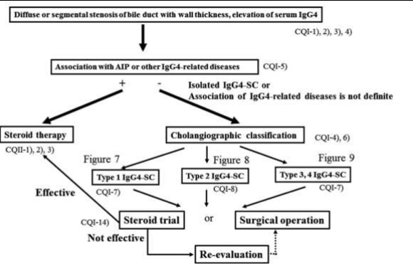 In addition, the Japanese Biliary Association also suggests clinical diagnostic criteria for IgG4-SC based on serum IgG4, biliary tract imaging, multi-organ involvement, histopathology or steroid therapy. It classifies IgG4-SC as definite, probable and possible diagnosis.10,37