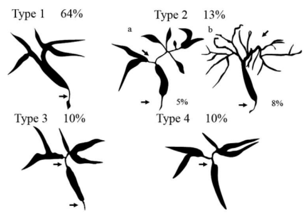 Figure 4 demonstrates the classification of SC with autimmune pancreatitis by cholangiography. Type 1: stenosis in lower common bile duct (CBD). Type 2: stenosis in intra and extrahepatic bile ducts, with 2a has prestenotic dilation and 2b without prestenotic dilation and reduced number of bile duct branches. Type 3: stenosis in both hilar hepatic lesions and lower CBD. Type 4: stenosis only in hilar hepatic lesions. Adapted from Kamisawa et al.19, 38