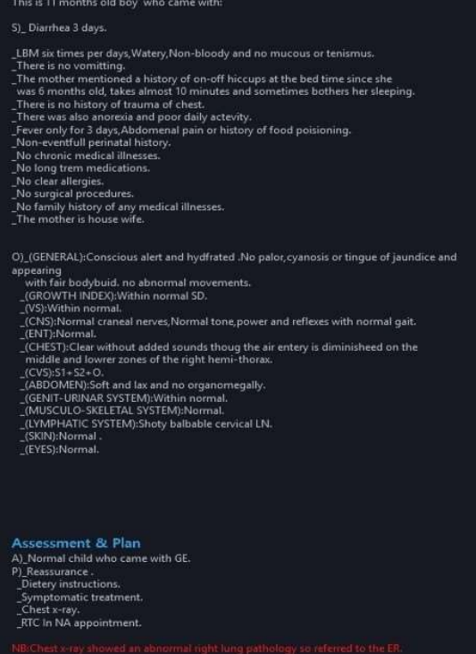 A 15-month-old girl who presented to my clinic with an episode of diarrhoea, cough and mild shortness of breath since of the ‘’BA’’ episode she is known to have and among the inspection I noticed a few bouts of hiccup between the coughs, further history taken from the mother about that bout of hiccups that was seeming not of value to the mother. That history questions directed about presence of any eventful pre-natal or peri-natal history like birth trauma or maternal or neonatal perinatal infections, head traumas, neck lumps, recurrent vomiting with abdominal distension, regurgitations, long term fever, chest traumas, contact with tuberculosis patient, also about the vaccination status which were came all with negative history from the mother side. Mother completed all prenatal clinical visits without any medical problems and mentioned normal results of all pre-natal gestation US images.