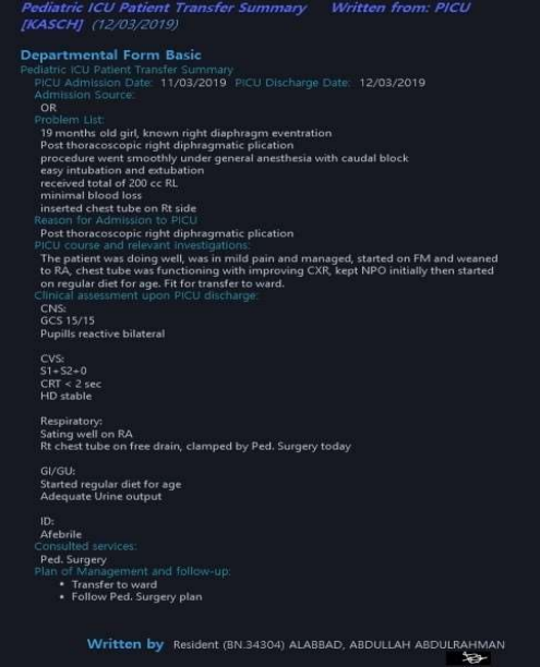 Figure 5: The first day post-operative report in the PICU for the patient