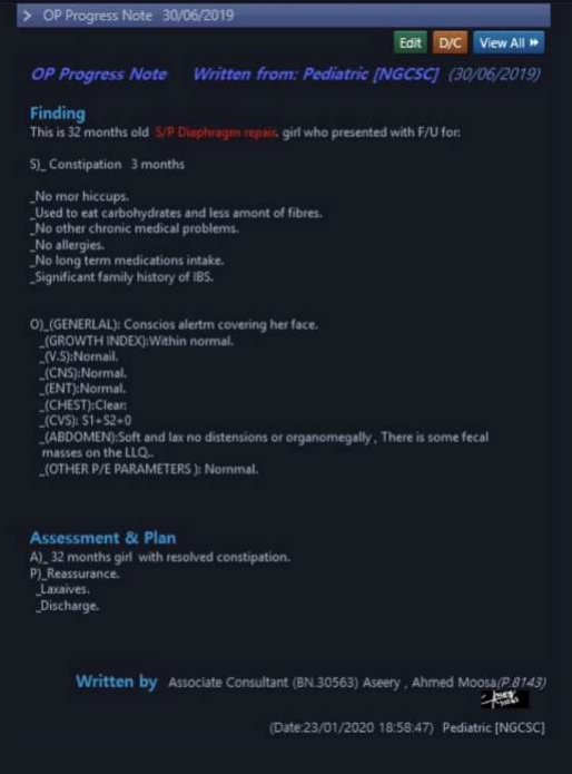 The mother despite of that did not seek a medical advice about that hiccups and most of the child’s visit to the clinics were since of the ‘’BA’’ attacks. Mother mentioned only one time among the clinical visits to their family physician in ‘’PHC’’ she asked about that hiccups and he reassured her as it is something transient and will self-limit with time and advice to burp the child frequently.