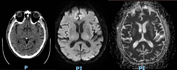 Figure 1: A- Axial cut of CT scan without contrast. B- Axial Diffusion-weighted imaging. C- Apparent diffusion coefficient map