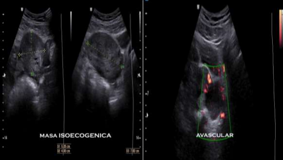 Figure 1. Ultrasound with evidence of an isoechogenic mass, with an enlarged, avascular ovary.